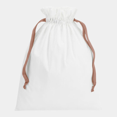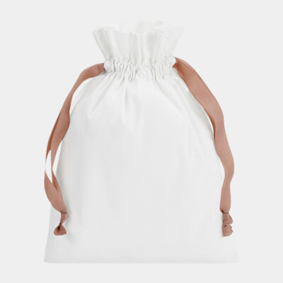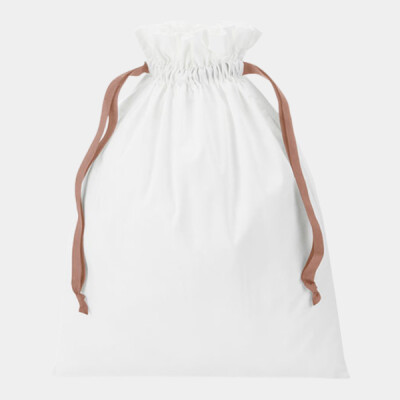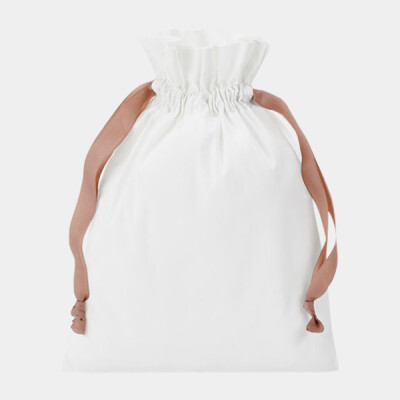 100% Brushed cotton, 140gsm (4.1oz/yd²). Perfect for seasonal gifting. Multipurpose use. Contrasting colour ribbon. Ribbon drawstring closure.TearAway label for easy rebranding.