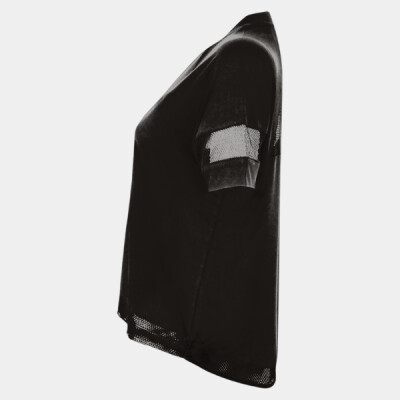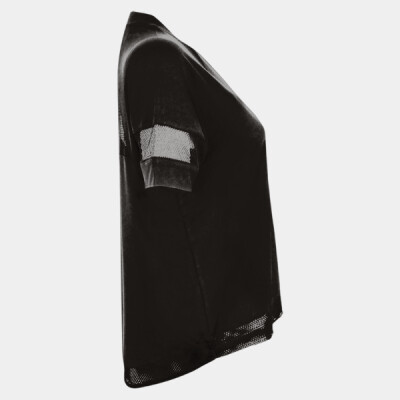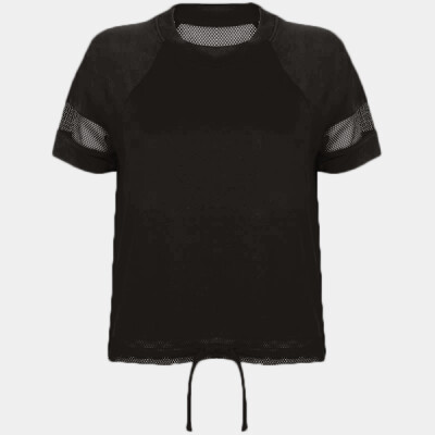 Oversize T, mesh back yoke and sleeve panels, draw cord hem with panel, lightweight soft hand feel fabric, tear-out label.